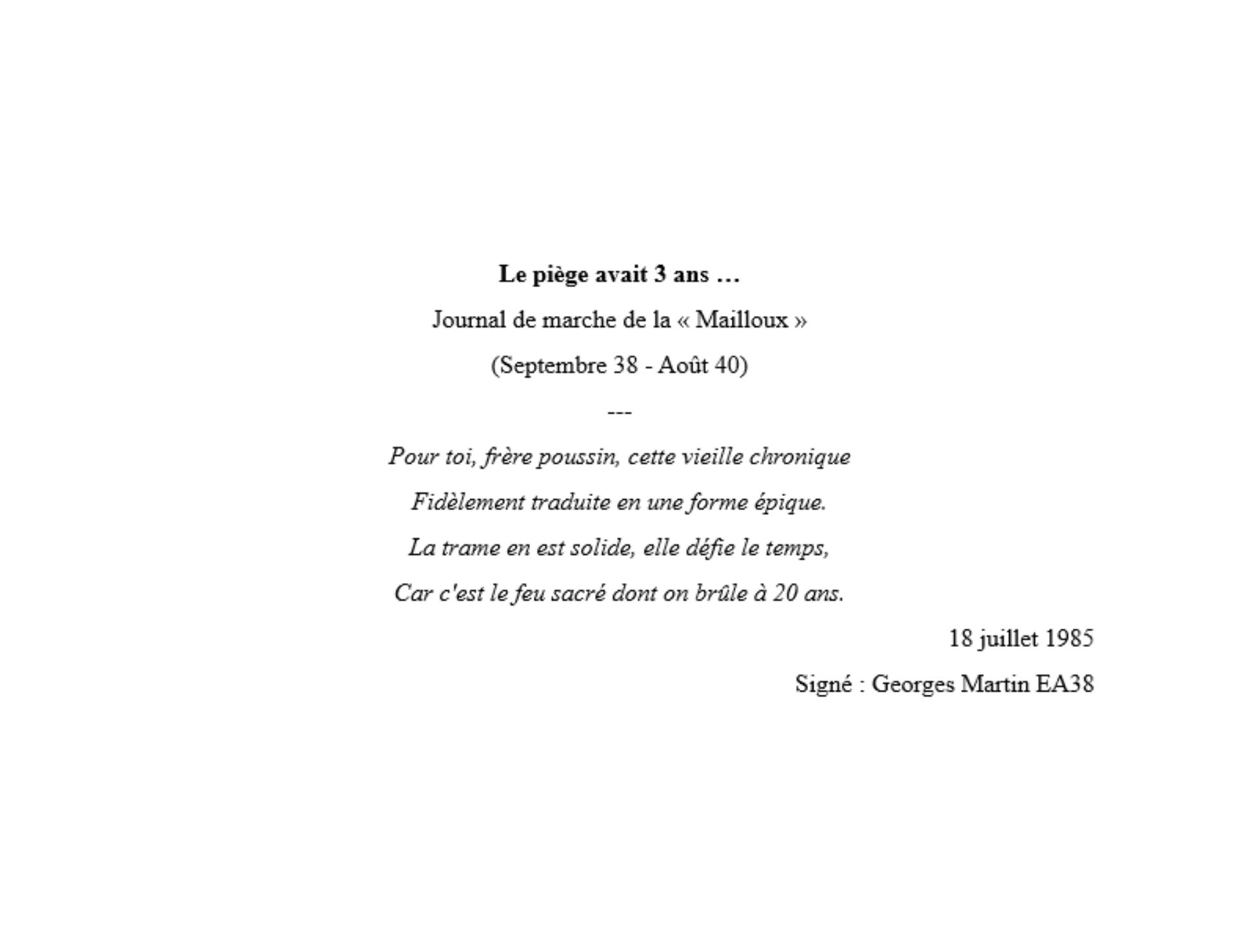 Le piège avait 3 ans … Journal de marche de la « Mailloux » (Septembre 38 – Août 40) — Pour toi, frère poussin, cette vieille chronique Fidèlement traduite en une forme …