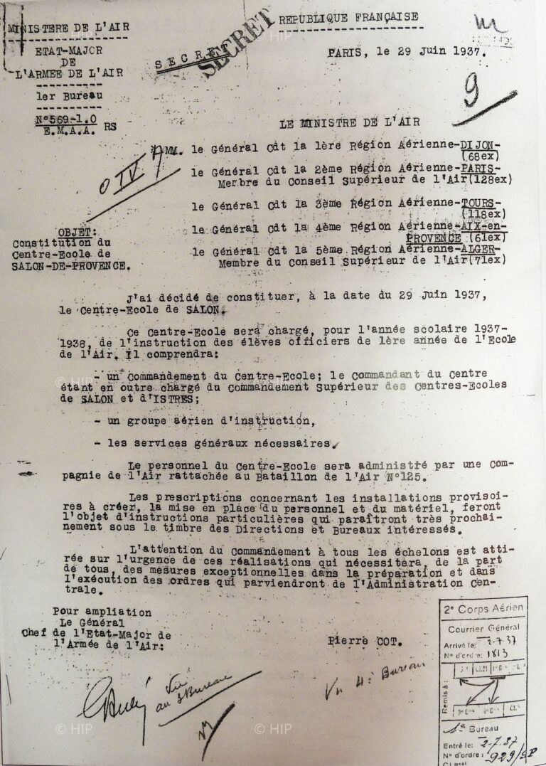 Première page de la décision ministérielle N° 569 du 29 juin 1937, créant le Centre-école de Salon-de-Provence.