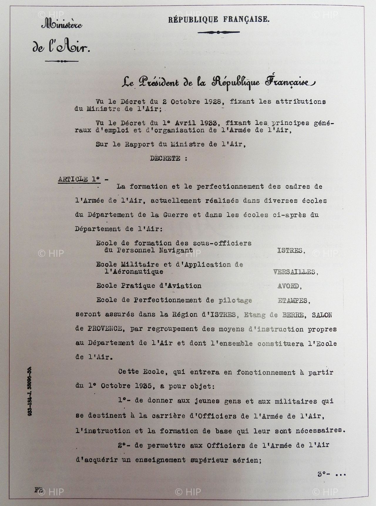 Première page du décret du 3 juin 1933 créant l’École de l’air.