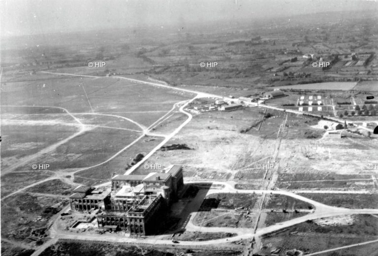 Le bâtiment de la direction de l'enseignement après les bombardements - vue aérienne en 1944-1945