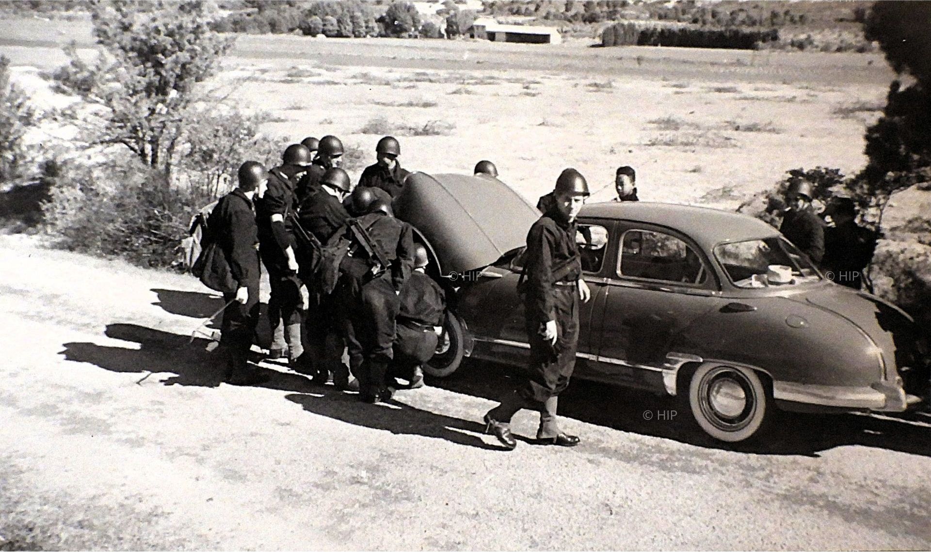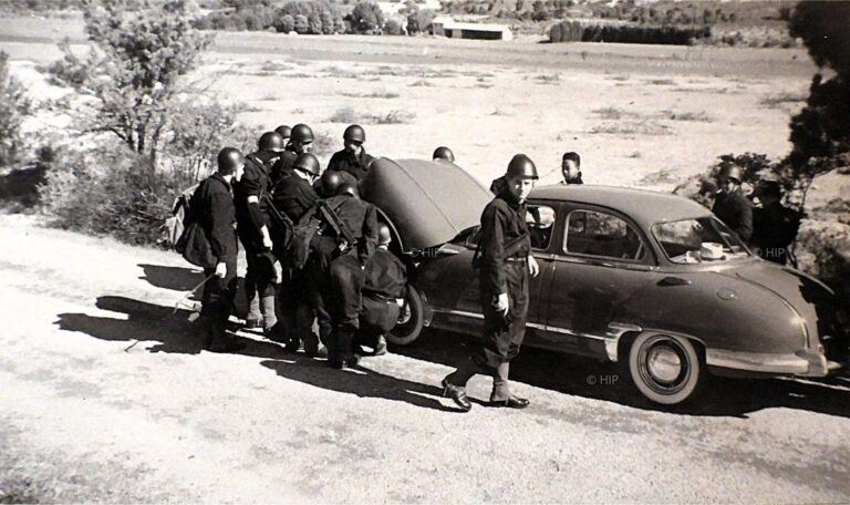 Les élèves de la promotion EMA 1954 s'occupent de la voiture du brigadier