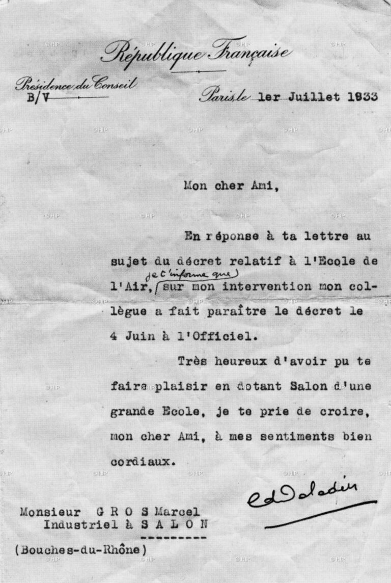 Lettre de M. Marcel Gros, industriel à Salon, au Président du Conseil, M. Édouard Daladier