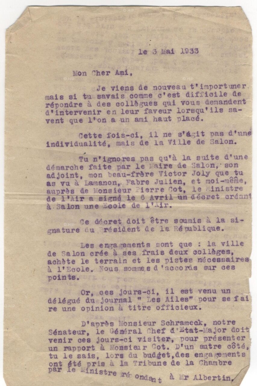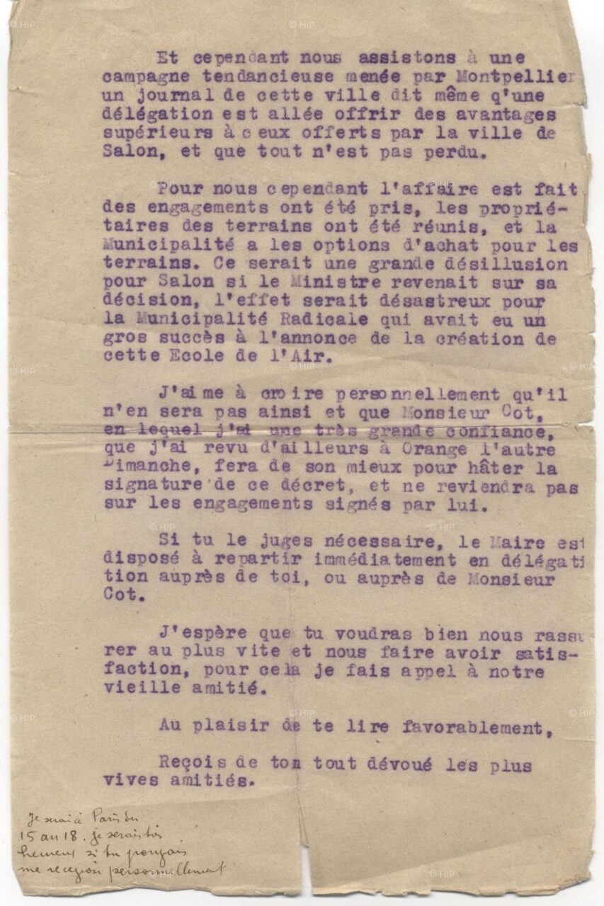 Complétons ce que nous écrivions jeudi dernier sur l’installation de l’École de l’Air à Salon-de Provence. Le ministre de l’Air est décidé, croyons-nous, à hâter la solution du problème que nous avons évoqué. La semaine dernière, une lettre est partie de la rue Saint-Didier à destination du Maire de Salon en lui rappelant que la Municipalité de la sympathique petite ville s’était engagée à obtenir, dans le délai d’un an, la mise à la disposition de l’Air de tous les terrains privés nécessaires à l’installation de l’École. Nous avons dit comment les prétentions exorbitantes des propriétaires s’opposaient à l’opération et l’empêchaient d’aboutir. Les terrains nécessaires à l’aménagement des pistes – sauf une – sont acquis. C’est le terrain de la dernière piste qui reste à acquérir. Le ministère de l’Air sous l’impulsion de M. Pierre Cot, prend peu à peu – et enfin – l’habitude de savoir ce qu’il veut. Si Salon-de-Provence tergiverse et ne peut donner à la question en cours une solution rapide et satisfaisante, l’Air est bien décidé à ne pas laisser retarder la réalisation de son programme par la négligence de quelques-uns et le lucre de quelques autres. Il passera outre et ira s’installer ailleurs. Et il aura raison.
