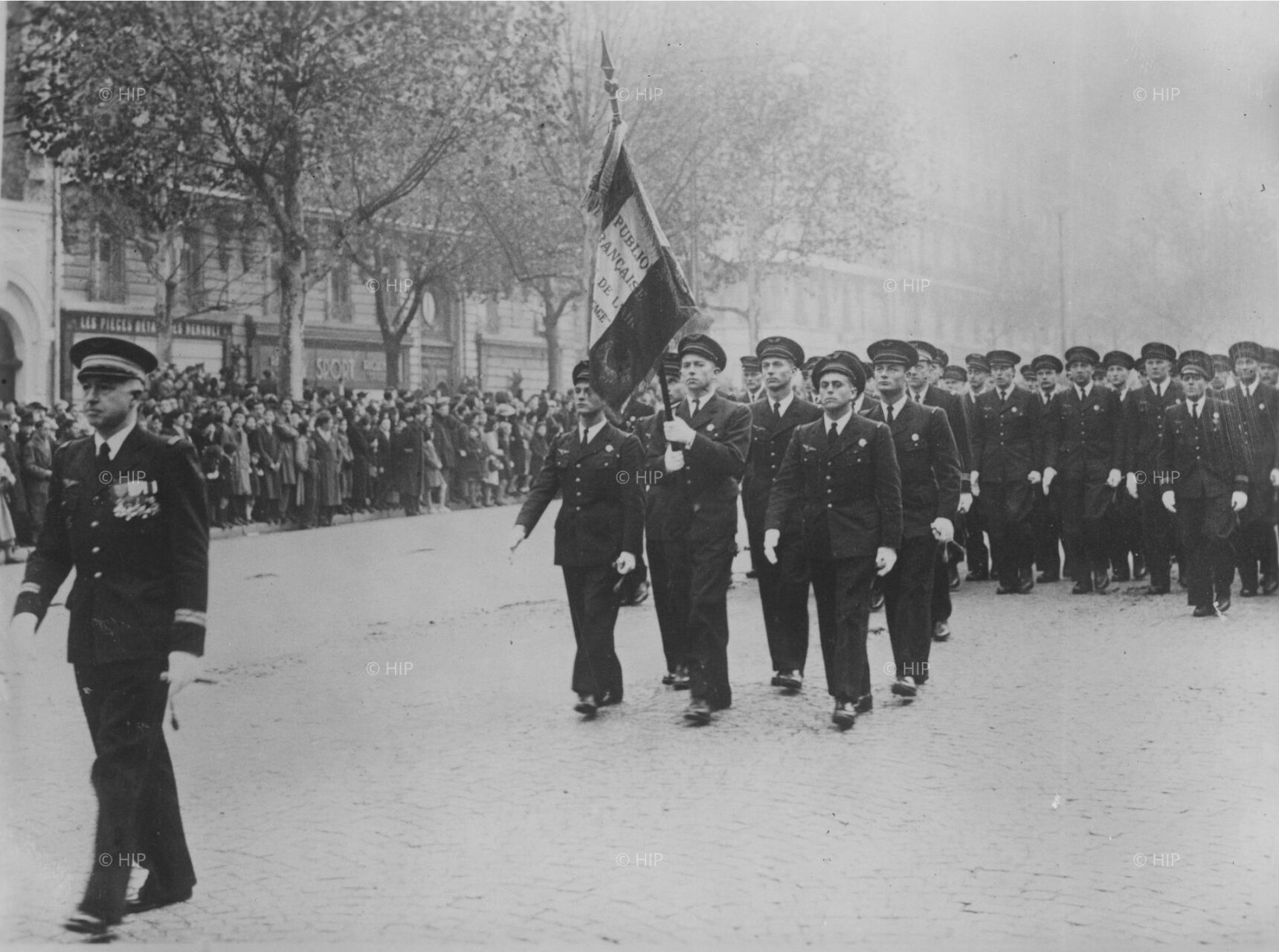 Le lieutenant-colonel Bezy, commandant de l'École de l'air entre 1945 et 1946, à la tête des élèves de l'École de l'air en 1946