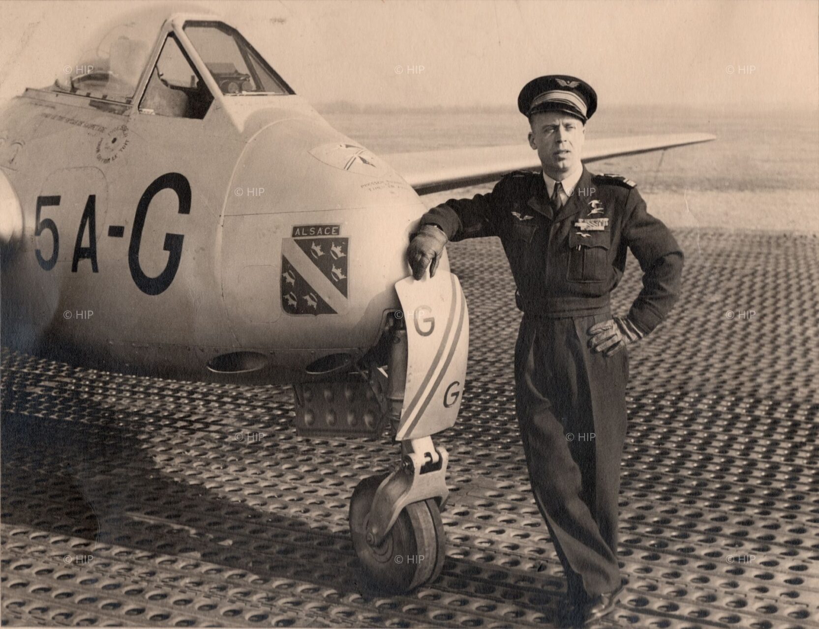 Le général Gabriel Gauthier, alors commandant de la 2ème escadre de chasse, sur la Base aérienne 102 de Dijon, devant un De Havilland Vampire